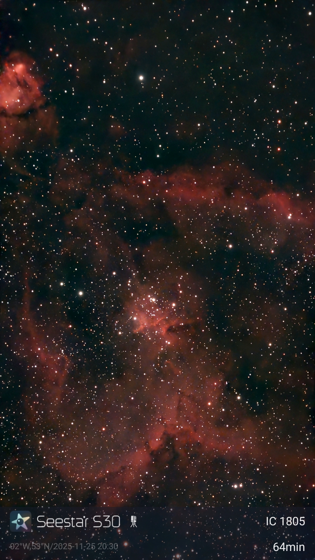 A narrow band SHO image of IC1805 the Heart Nebula.Taken with the 80mm Skywatcher. 45 minutes for H alpha and OIII and 90 minutes for SII.