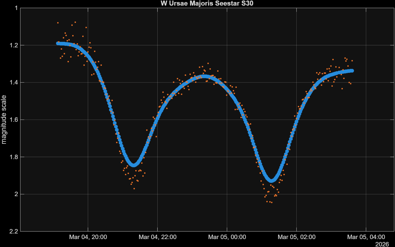 The eclipsing binary W UMA using a Seestar S30 and 5 second exposures. Each data point comes from a stack of 12 images, so 1 minute total exposure. The blue points use further a moving average. Raw 5 second data is very noisy.